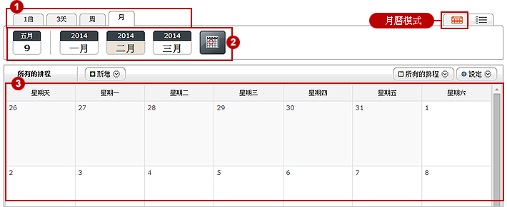 | 3 | 月曆/清單模式:您可使用月曆或清單模式來管理排程。 |
